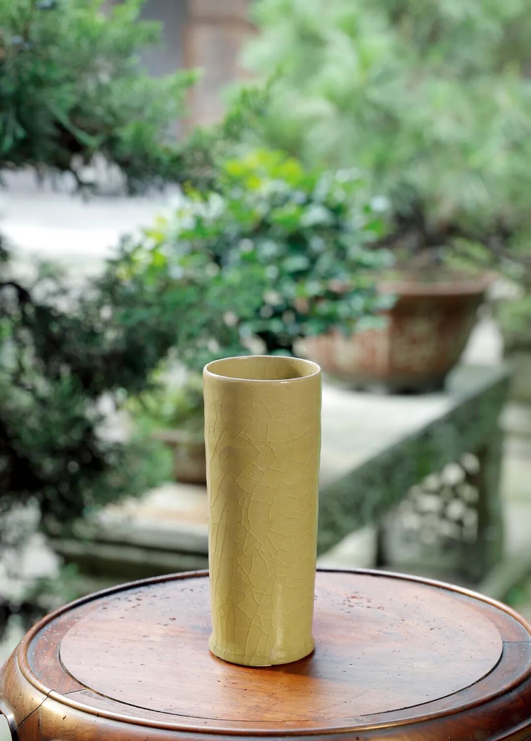 此龙泉窑筒式花插仿商周青铜器造型,圆口直腹,腹底内收,足底露胎,胎体坚致。通身施米黄釉,釉面沈稳莹润,大小纹片相间,釉面匀凈若玉,娇嫩可人,极富质朴的艺术美感,是龙泉窑的典型美器。