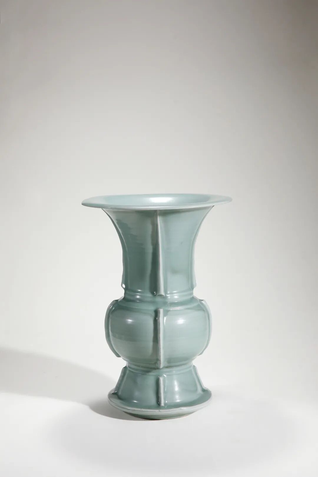 此龙泉窑出戟尊为仿青铜器造型而来。宋代钧窑、官窑均有烧造,明洪武、嘉靖、万历时期沿袭。此尊喇叭形口,长颈,扁鼓形腹,圈足外撇。为颈、腹、足四面堆贴稜脊。器身边稜处因高温烧成时熔融垂流,致使釉层变薄,隐露白色胎骨。