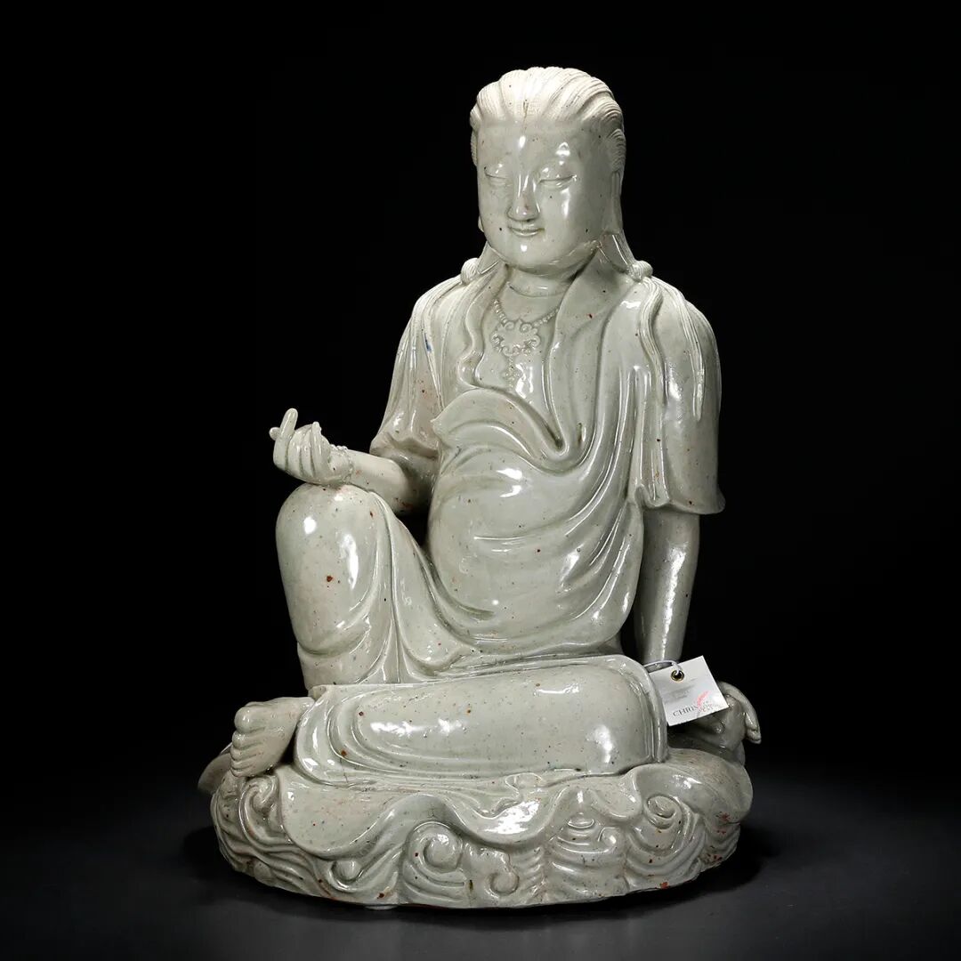 说明:观音呈自在坐姿,右膝曲起,左足半趺,右手前伸置于膝上,左手撑于身后。观音发丝细密舒整,梳两络垂肩上,胸前配饰璎珞,身着天衣,衣纹褶皱疏密有致,飘逸流畅。法相饱满宽阔,神态自在安详,双目微闭下敛,清净庄严。身下海浪翻卷象征观音的超然法力,以大海为怀。漳州窑是对漳州地区窑业的总称,是明清时期中国外销瓷的重要产地之一,造像精品者存世较少。此件坐像通体施青白釉,釉色温润,胎质细腻,呈象牙白色,内敛典雅而不失华美,与造像相得益彰,彰显出观音庄严祥和之相,为一尊难得的漳州窑造像珍品。