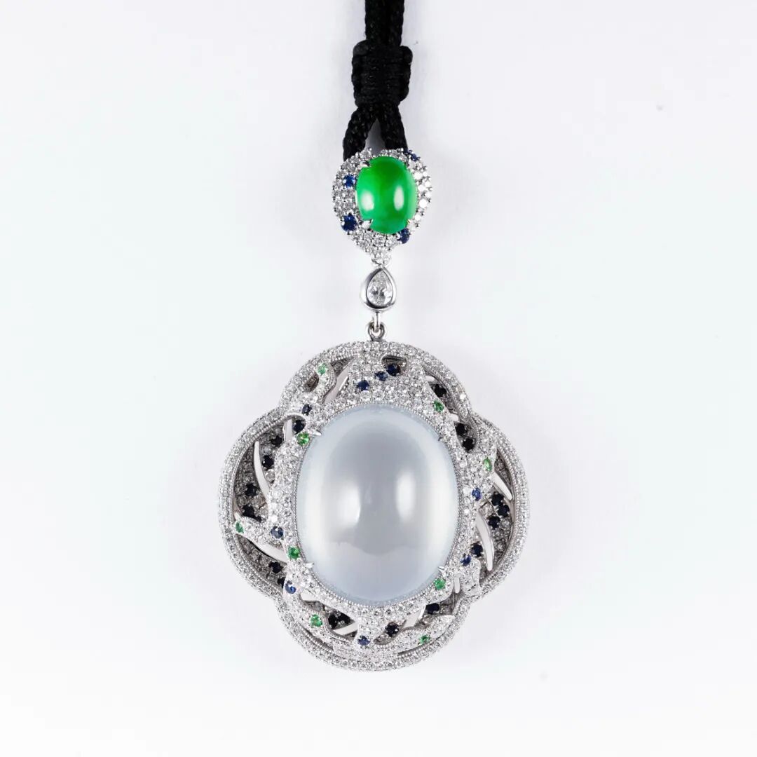描述:18K白金镶嵌玻璃种白冰翡翠蛋面,配镶钻石、蓝宝、沙佛莱石作点缀。翡翠质地清透明净,细腻莹亮,结构致密,种水极佳。附证书一帧。