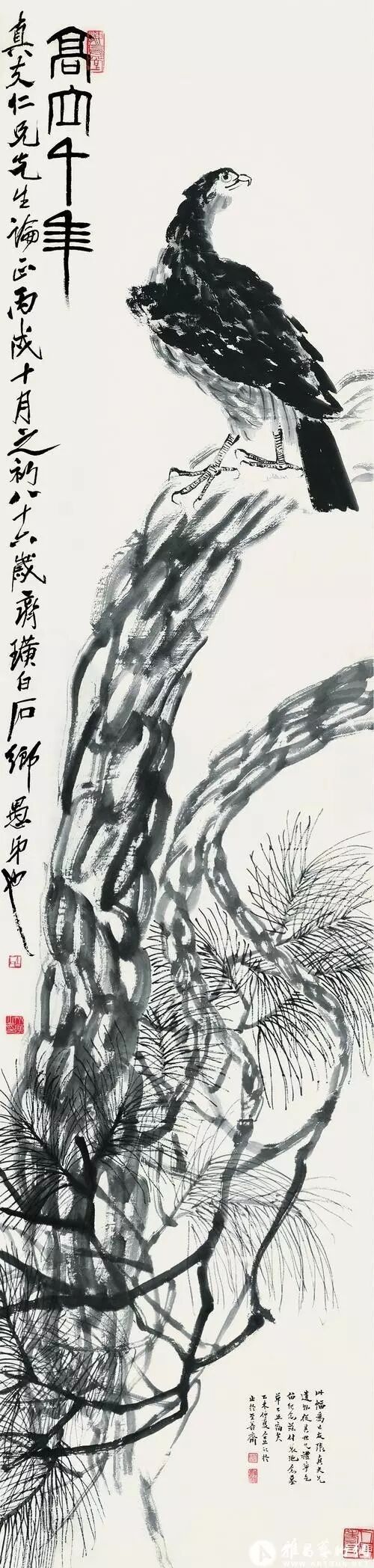 白石老人毕生勤勉,治艺如农人耘田,一生躬耕赢得了千秋尊崇。老人平生绘事以花鸟为工,其大写意花鸟和工笔草虫构成了齐派艺术的两翼。在他留下的数以万计的画作中,《松鹰图》无疑是其最为经意的画题。