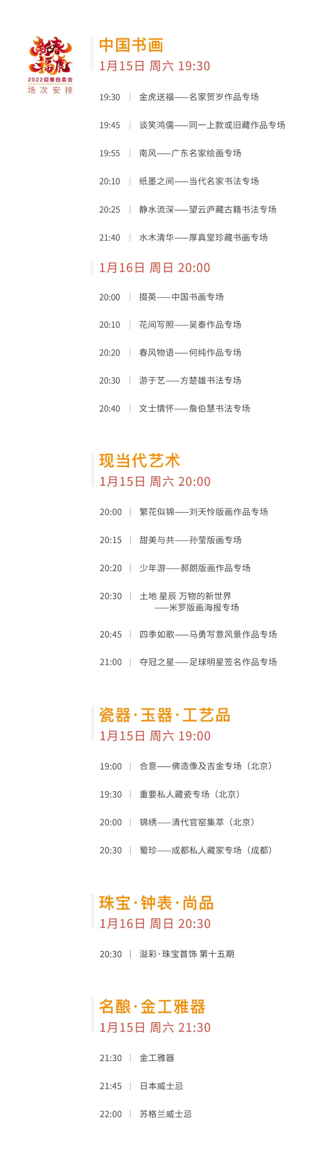 现当代艺术版块本次汇聚孙莹、刘天怜、郝朗三位年轻艺术家版画专场,艺术大师米罗石版画精品专场,马勇写意风景作品专场,为广大藏友提供精彩纷呈的新年礼物,既活泼靓丽,又兼具收藏价值。愿各位,此去繁花似锦,归来仍是少年。溢彩·珠宝首饰专场第十五期精心准备了如梦如幻彩宝翡翠,专场推荐之拍品保证品质的同时兼具性价比,邀您一起享受花朵般绽放的芬芳新意,开启惊喜、趣味、便捷的线上拍卖之旅。又是一年“腊月”到,一岁之末为“腊”,意为新旧交替,辞旧迎新。日本及苏格兰威士忌·金工雅器专场为您提前备上一份犒劳自己,阖家团圆的礼物。![]()