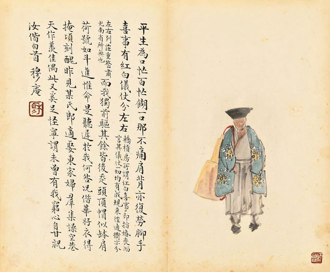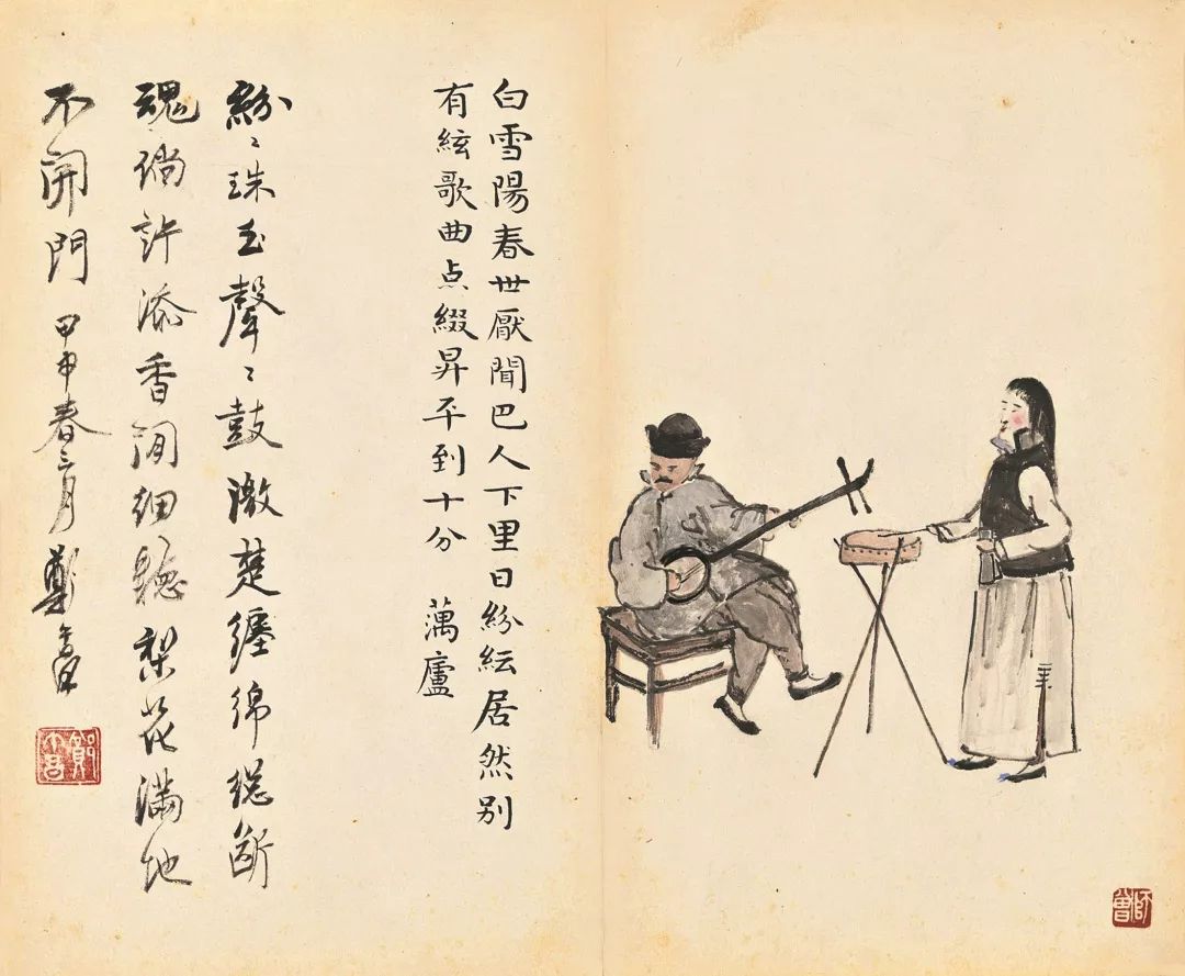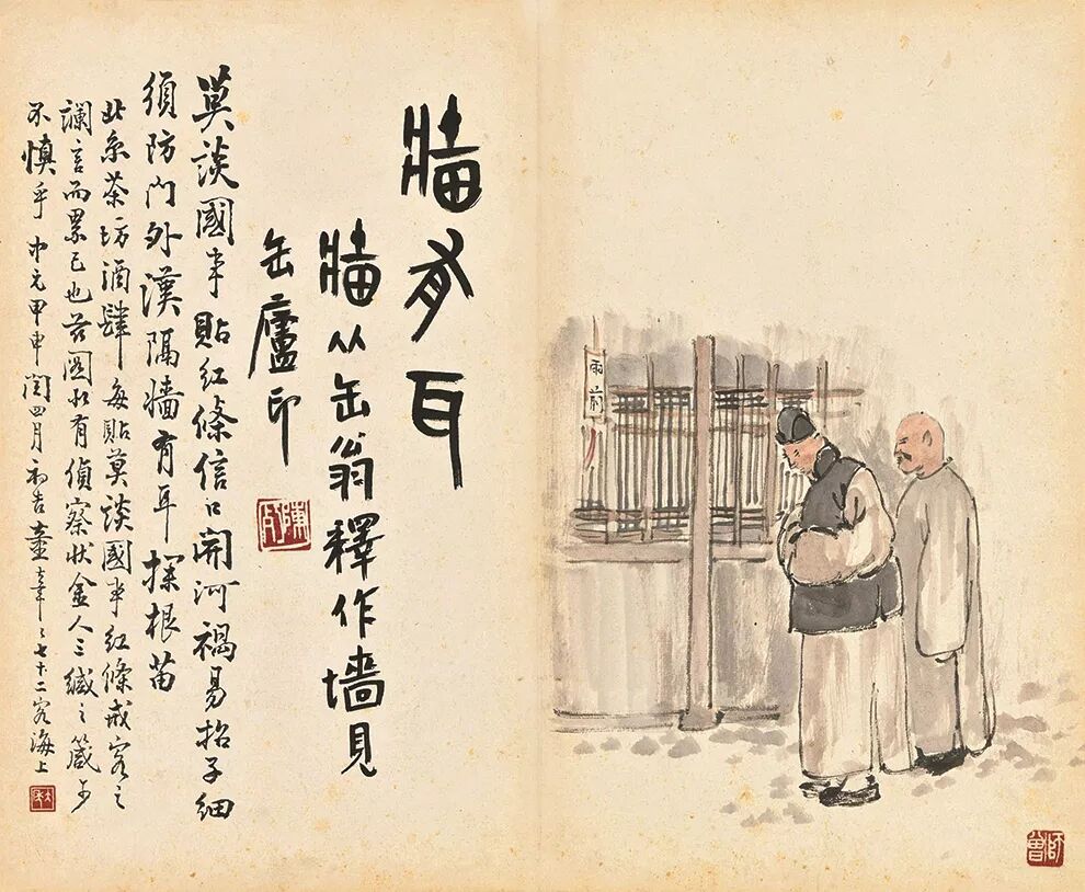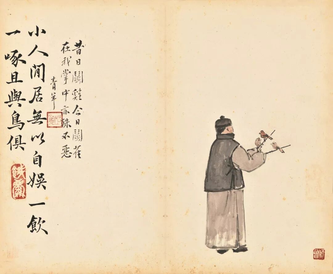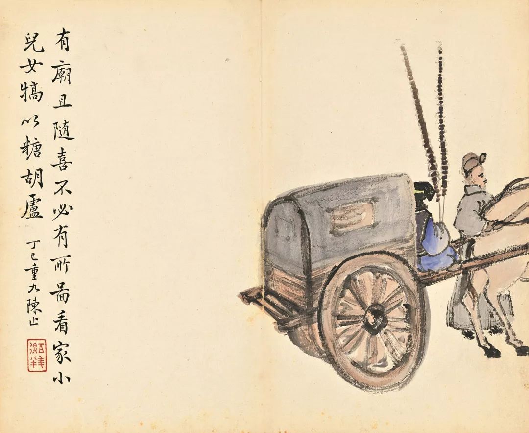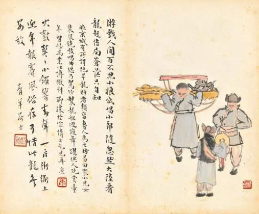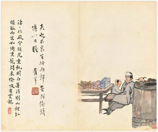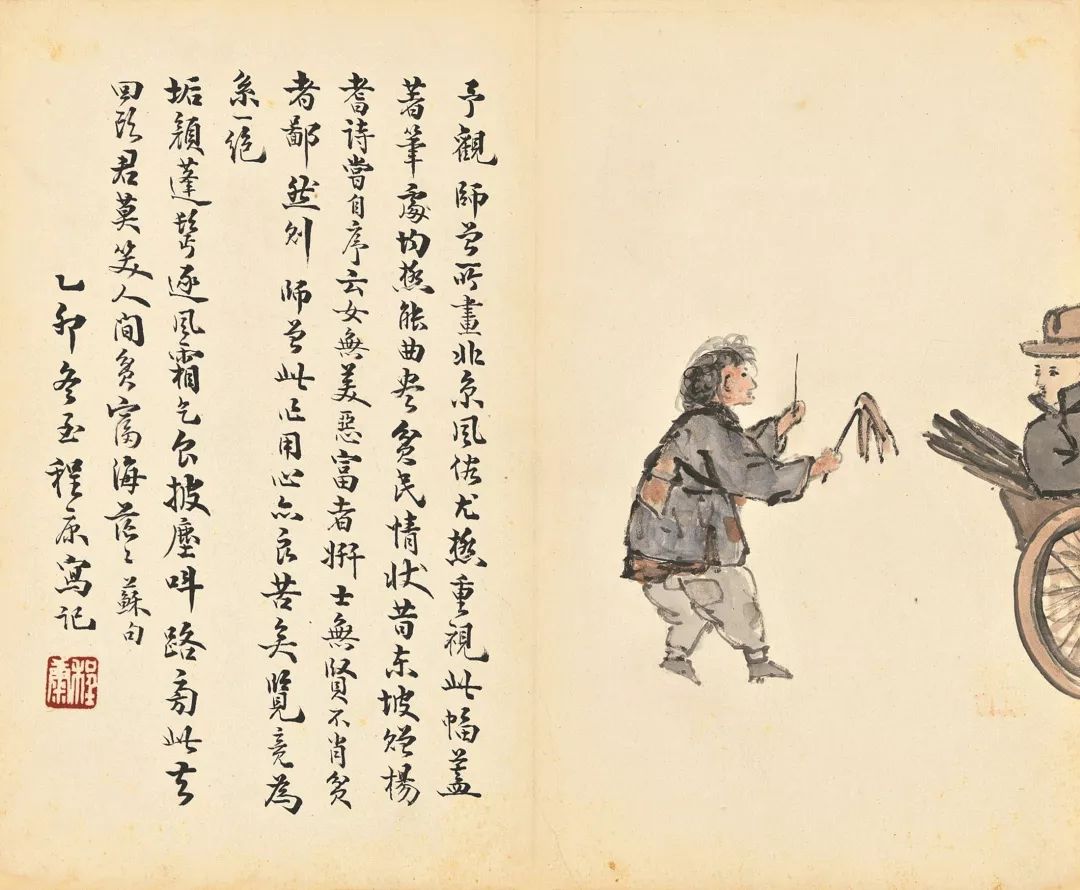 陈师曾的《北京风俗》册页,以旧京风俗入画,描绘了民间的红白喜事、风俗人情,包括封建遗老之穷愁无聊等情状,其中还涉及到时政的讥讽而类如漫画,充满生活气息和人间情味。