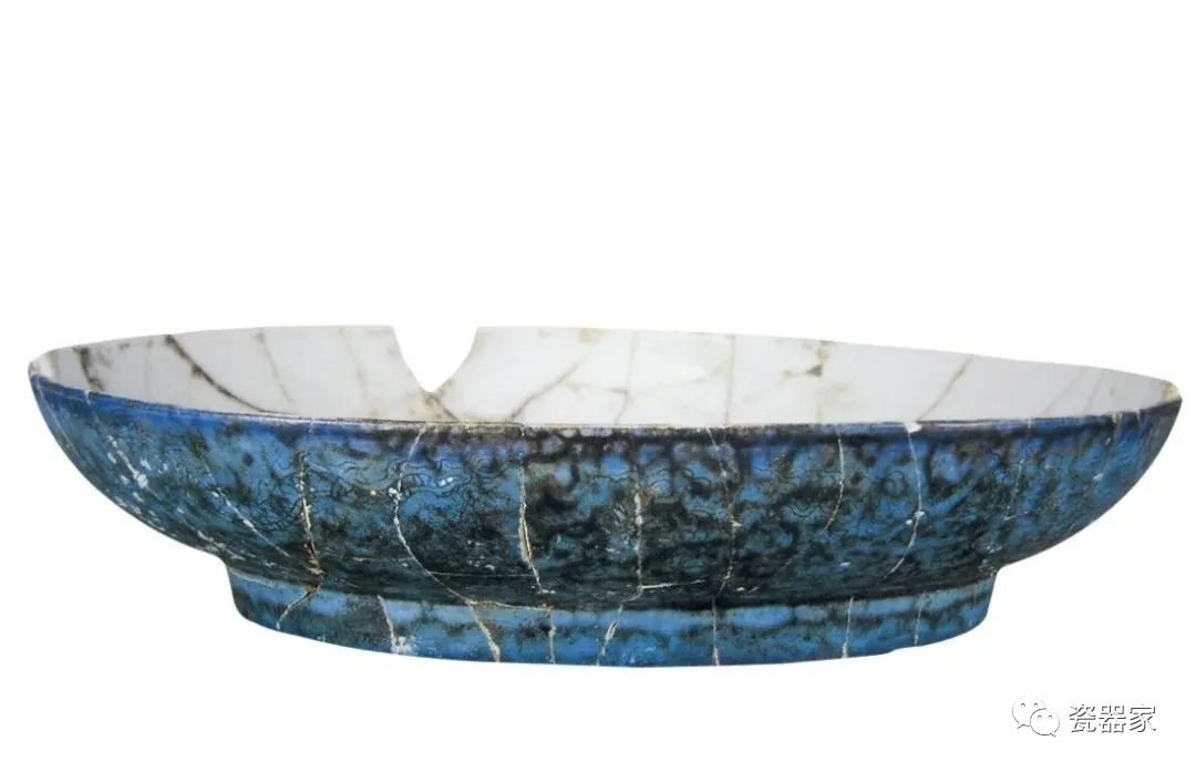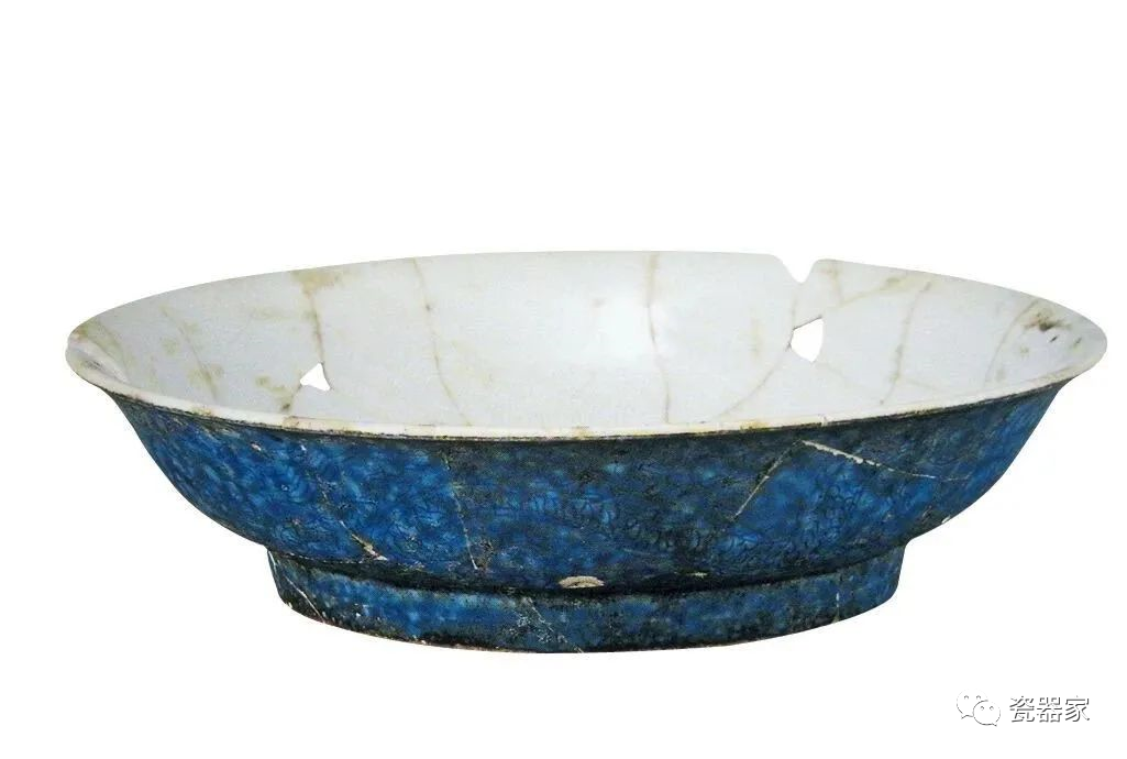 洒蓝釉刻龙纹碟,高3.7厘米,口径15.2厘米,刻龙纹与上述器相似。洒蓝釉是一种以钴着色的低温铅釉,蓝中夹以白色小斑块,分布自然,因似雪花片挥洒在蓝釉之上,故名洒蓝,又称雪花蓝,在1000℃以下烧成。这类瓷釉以铅作溶剂,这种利用低温熔块铅质釉作成的洒蓝釉显然是仿宋钧窑之窑变花釉,清乾隆时期演变为炉钧花釉。
