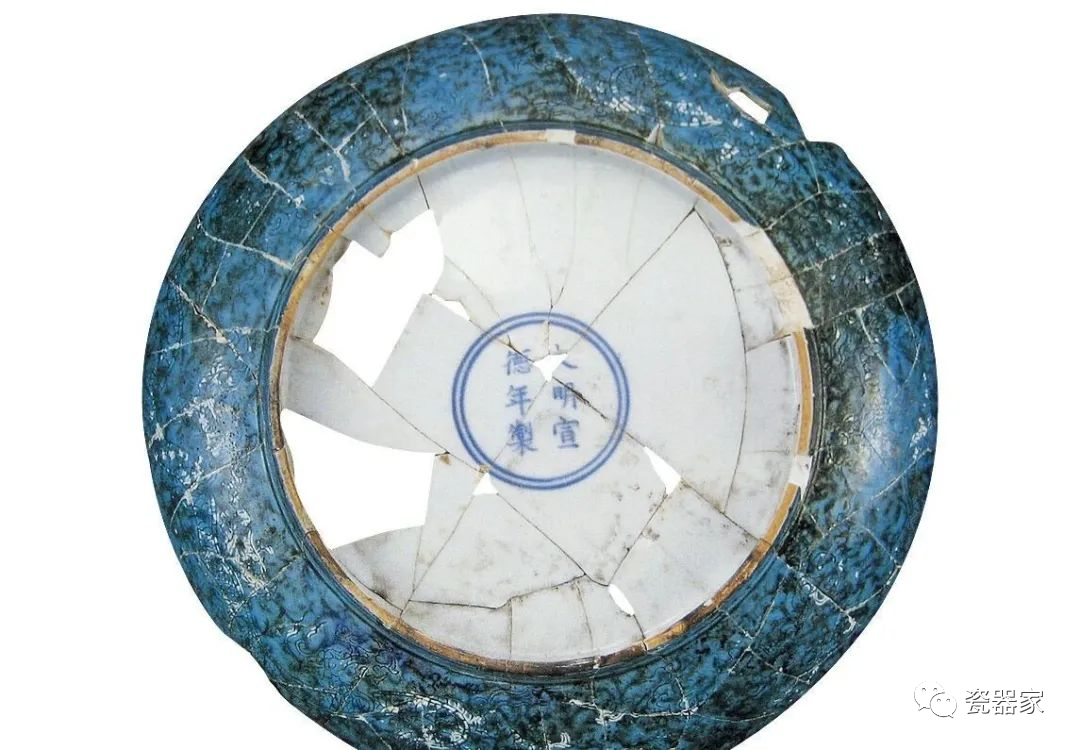 洒蓝釉刻花纹盘,有敞口式和撇口式两种,盘心白釉,有刻品字云和素面两种,外壁均刻赶珠龙纹,盘底书青花“大明宣德年制”六字款。