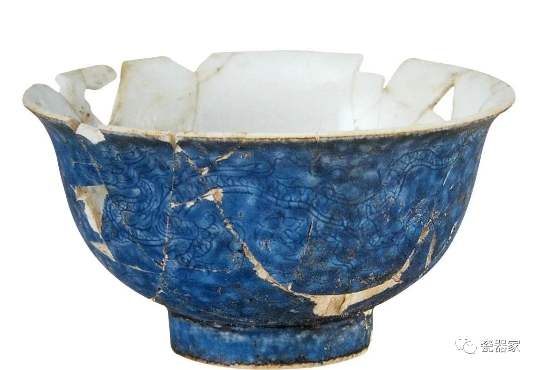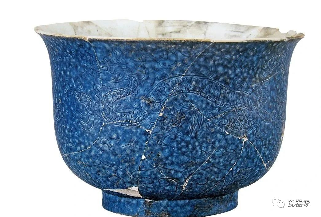 明宣德洒蓝釉靶盏残片标本 上为洒蓝釉刻龙纹梅瓶残片;