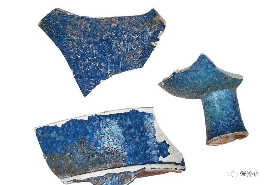 左下为洒蓝釉水仙盆残片;右为洒蓝釉靶盏残片 1