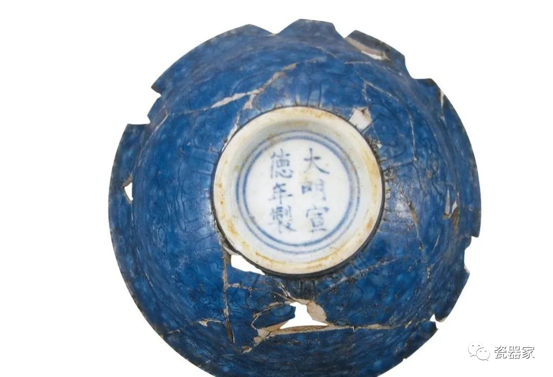 明宣德洒蓝釉刻龙纹碗底款