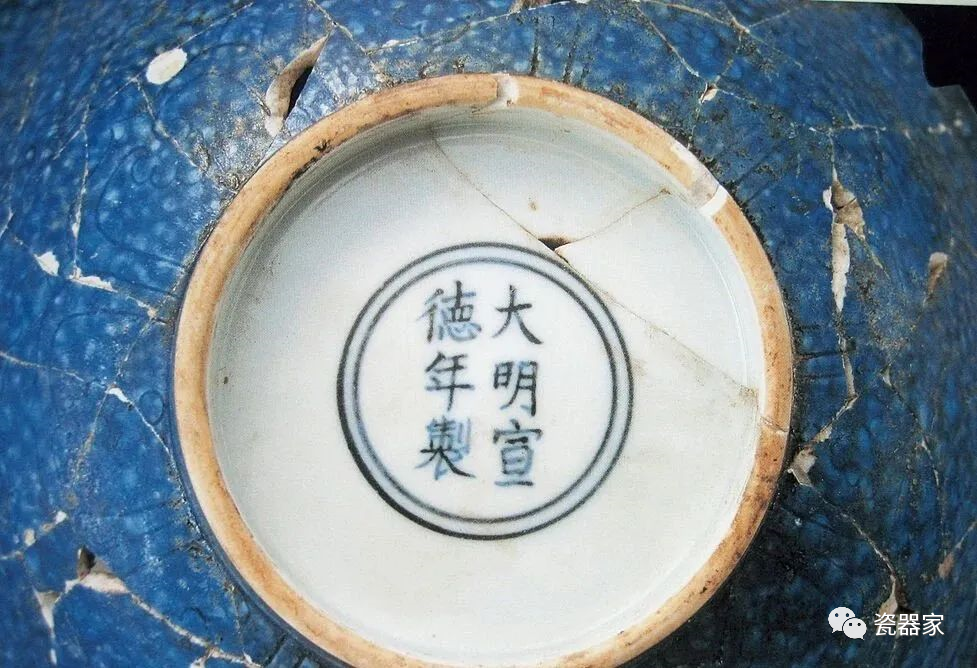 明宣德洒蓝釉刻龙纹大罐底款