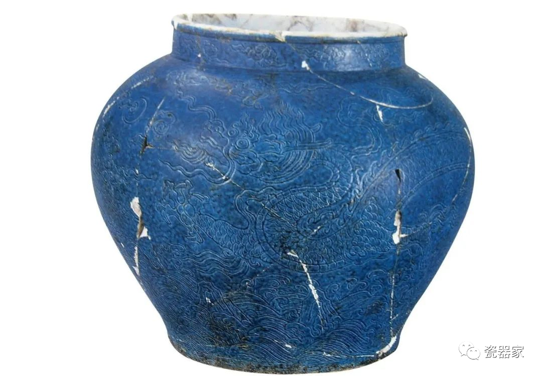 明宣德洒蓝釉刻龙纹大罐