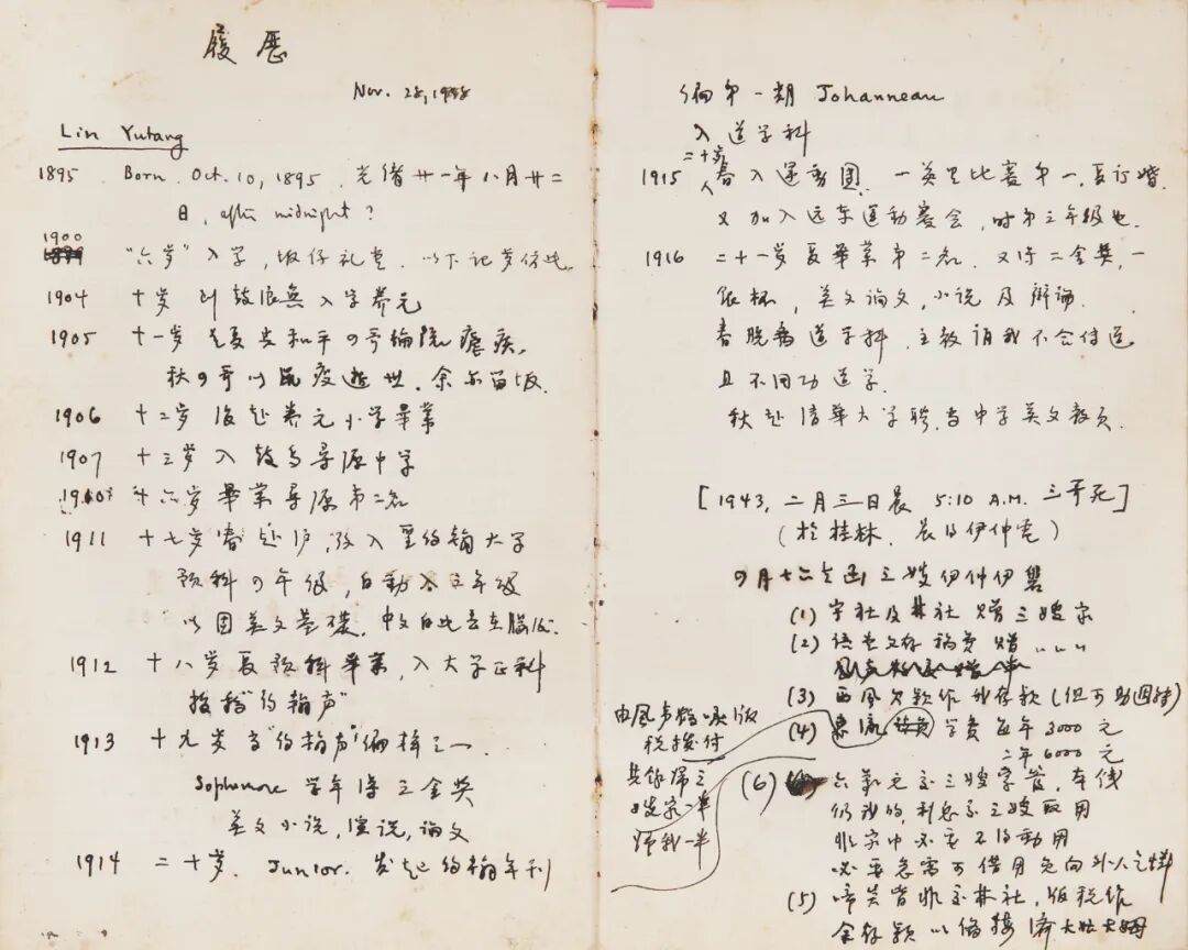 林语堂另于1938年11月28日手书有个人履历一份。自述1895年至1916年青年时期个人历程,后成为自传之原始材料。他还对福建林廖二家族的履历着墨颇多,于国于家,有情有怀。以手绘十二生肖并罗列林氏双亲及远近亲属生日和生肖年代表的形式,铭记诸人。