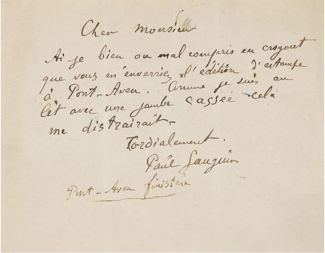 说明:此为后印象派大师保罗·高更致记者亲笔信一通,信件中高更表示他因腿部骨折而卧病在床,并在此期间创作了一些版画以作消遣,同时他或将这些版画作品一并寄予(这位记者)。信件提及之地蓬塔旺是法国知名的艺术家聚集地,高更于19世纪80年代末至90年代初在此地度过了漫长的时期,这亦是他人生创作的一个重要阶段。