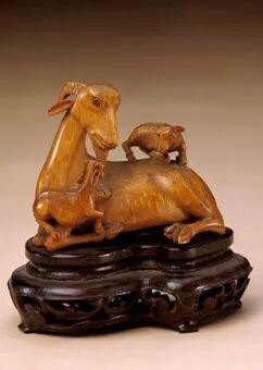 此竹根雕镇纸以一大二小三只山羊组合而成,寓意“三阳开泰”。母羊向一侧蜷肢而卧,一只小羊伏于母羊背上俯身下望,后腿努力支撑起身体;另一只靠在母羊身侧,似欲顺着母羊之腿上爬,与前只小羊相望嬉戏。