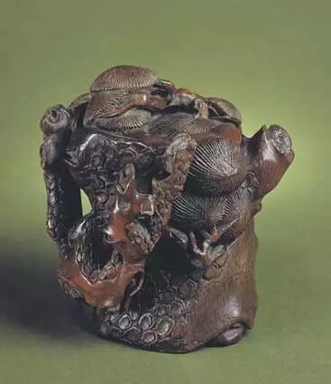 此壶制于明代万历、天启时期(1573—1627年),是濮仲谦的众多精品之一。作者根据材料的自然形状,精心设计,巧镂细刻,树身苍古老屈曲,满布鳞皮,并配以枝叶,精致古雅。乾隆皇帝曾多次为濮仲谦所制的竹刻御题诗句,赞扬他刻竹圆润、不留锋刃的艺术风格。