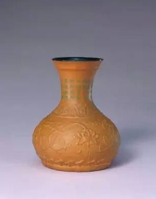 此瓶细颈,溜肩,鼓腹,器形规整饱满。口部膨起如蒜头式,饰3道凸弦纹,并镶染色牙口。自口部向下直至腹部有6道凹线纹垂直贯通,将器身划分成6瓣,每瓣自成装饰单元,均于颈下饰阳文如意云头纹、联弧纹及卷草垂肩纹,腹部饰独窠莲花纹并有卷草袅娜向上。下腹亦有凸弦纹2道。器底为6瓣葵花形圈足,内有阳文楷书“康熙赏玩”印章款。此器所用范制之法,其纹饰悉出天然,又不违人意,巧夺天工,符合中国传统的审美追求。范匏之法言易行难,此瓶精美程度,无疑代表了康熙时宫廷范匏所达到的最高水平。
