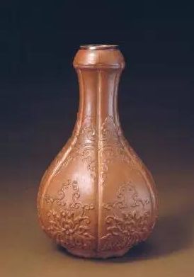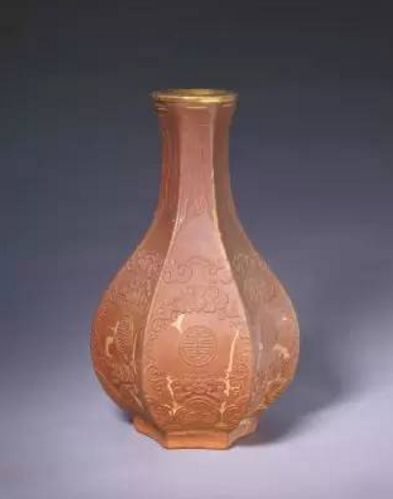 此瓶侈口,细颈,溜肩,鼓腹,六棱式,底有六方矮圈足。器口六面分别刻双线纹,其下为阳文回纹带,蕉叶纹垂蔽颈部,器身以莲花卷草构成开光图案,内为团寿纹,下腹近足处饰如意云头纹。器体起棱处刚劲有力,棱线之间的各面甚至微微内凹,使器形极富张扬的刚性,而各部分的连结处及器表纹饰绝无生硬的折线,细细品味,其强健中不失婀娜。瓶配有铜制内胆。外底阳文方框中有“康熙赏玩”四字楷书款。