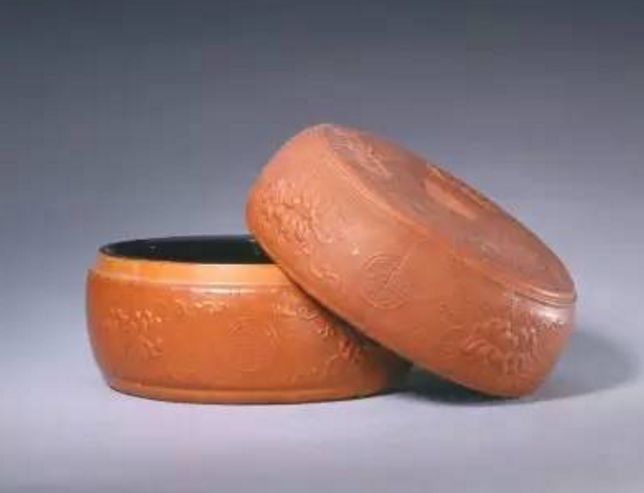 此盒呈鼓式,盖、身二部分的高度与结构相同,以子母口扣合。盒盖立面与盒顶交界处有3道凸弦纹,形成阶状的独特效果,而器身立面与盒底的交界仅以一条凹线划分。器身、盖面纹饰相同,皆以莲花与团寿相间为饰。底微凹入一周,饰卷草纹,中圆形平面内有“康熙赏玩”四字款识,但较为模糊。从盖顶与底面均有脐状斑痕,可知盒、盖两部分为分别范成,然竟能严丝合缝,分毫不差,真可谓鬼斧神工。