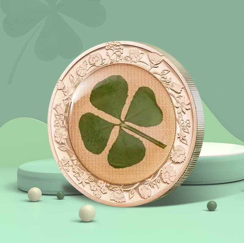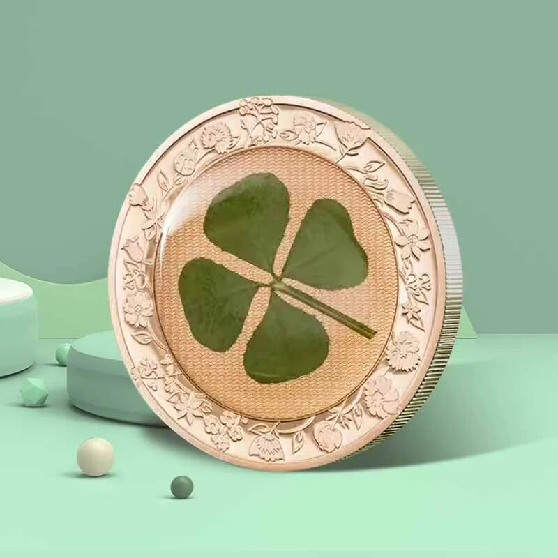 我们这次带给大家的这枚四叶草银币,里面镶嵌了一枚真正的四叶草;表面压铸了硅胶,使得整枚币看起来波光流转,很是灵动。