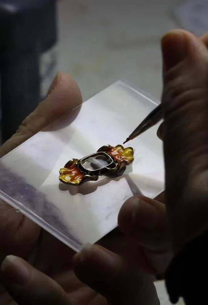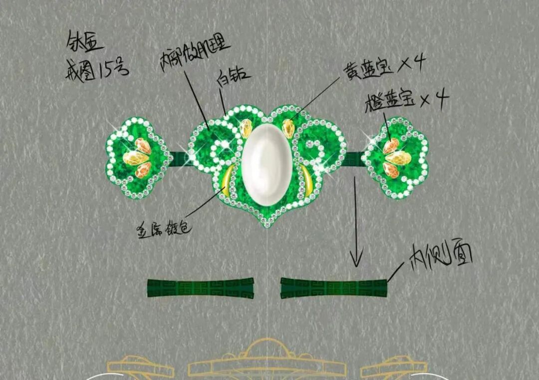 为了表现“万春亭”四季之景,我在亭子的配色上选取带有绿、黄、橘、白的四色宝石,多种颜色碰撞、交融,又在巧妙的设计下,达到了完美的平衡;在亭子的结构上,看似做了三层,实而为四层,我穿插运用多种镶嵌方式,配合中国传统珐琅工艺,让这件作品打破了时间和空间的界限,四季融为一体,定格在这一瞬间;同时,也象征着凝聚中华匠人的智慧,跨越历史长河,来到今天。