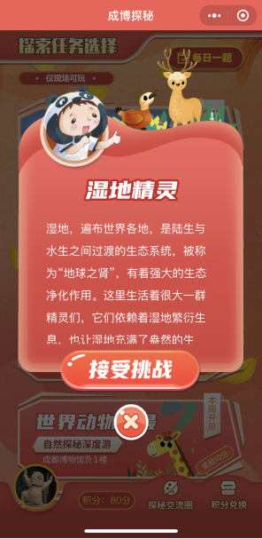 新栏目:“成博探秘”小程序新增了“每日一题”栏目,当不能到展厅参加探索游的时候,在馆外也可以学习动物知识,同样可以获得积分换取奖品。每一天,这里都会更新一道与动物知识相关的问答,回答正确后,可以获得1个积分,当积分攒到一定的数目时,便可以前往积分商城兑换礼物。通过每日的打卡,收获新知识,收获世界无限的奥秘!