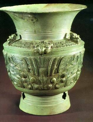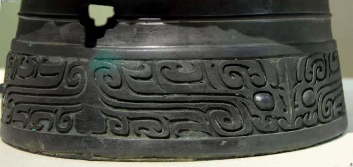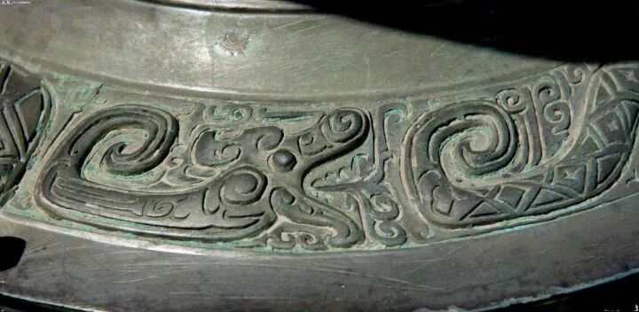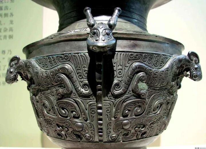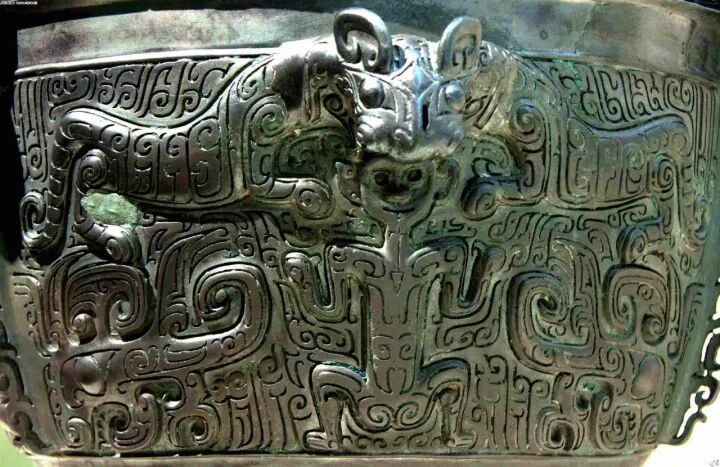 这种纹样象征古代传说中一种贪食的凶兽饕餮的面形。龙虎尊的肩部饰以三条蜿蜒向前的龙,龙头突出肩外。腹部纹饰为一个虎头两个虎身,虎口之下蹲一双臂屈举的人,神情悲惧。人头衔于虎口之中。虎身下方以扉棱为界,饰两夔龙相对组成的兽面。圈足上部有弦纹,并开有十字形镂孔。