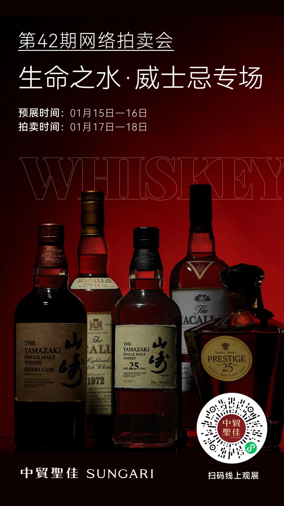 1月17日,2022年中贸圣佳首次网拍,生命之水·威士忌专场Ⅱ于12月17日接力开拍,再续精彩篇章!共上拍38件珍品,酒体丰腴,各具特色,以独特的风味口感带给您全新体验,是您目前投资收藏的上佳之选,欢迎广大藏友扫码参拍!