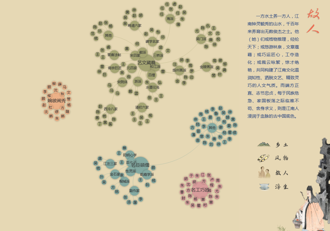 秉承上海博物馆数字展览的研究特色,“赶上春——江南文化数字专题”尝试挖掘众多精美文物背后的故事,借助数字人文的研究方法,以主题词云的形式,展现江南人物的辉煌过往。