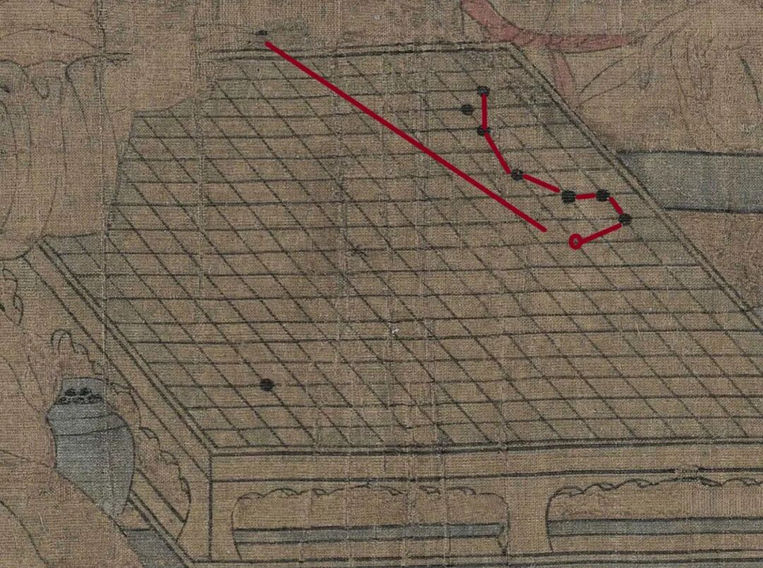 简单解释一下这八枚黑子里的两枚:中国古代有一种“座子制”,即在开局前,黑白双方在角上的星位各放二子。这里,棋盘的东北角和西南角,已落了两枚星位座子。