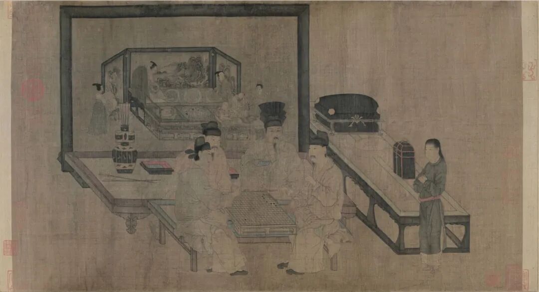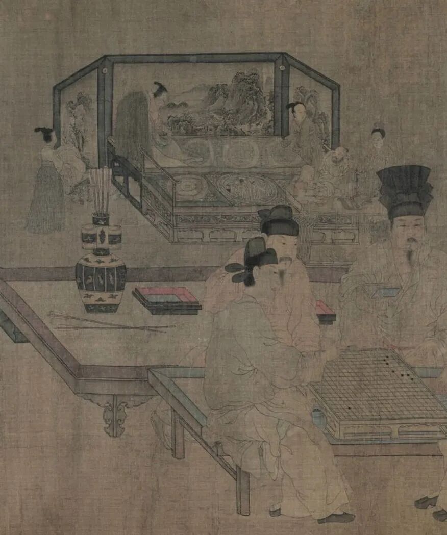 在《重屏会棋图》上,棋盘并不是惟一的戏台。