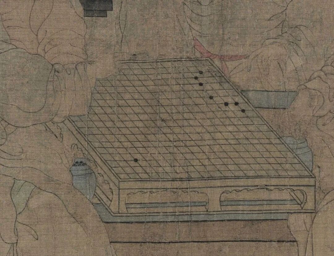 据说,周文矩极善于让静止的细节表现出时间的流动性,比如散放着的箭杆、打开的漆盒、尚未打开的食盒暗戳戳地表示兄弟们刚刚玩过了投壶,现在正在下棋,一会儿还要一起用点心……他亦善于挑动观者的想象力,让观者自己在脑洞深处补一出大戏,比如这个八枚黑子的棋盘。
