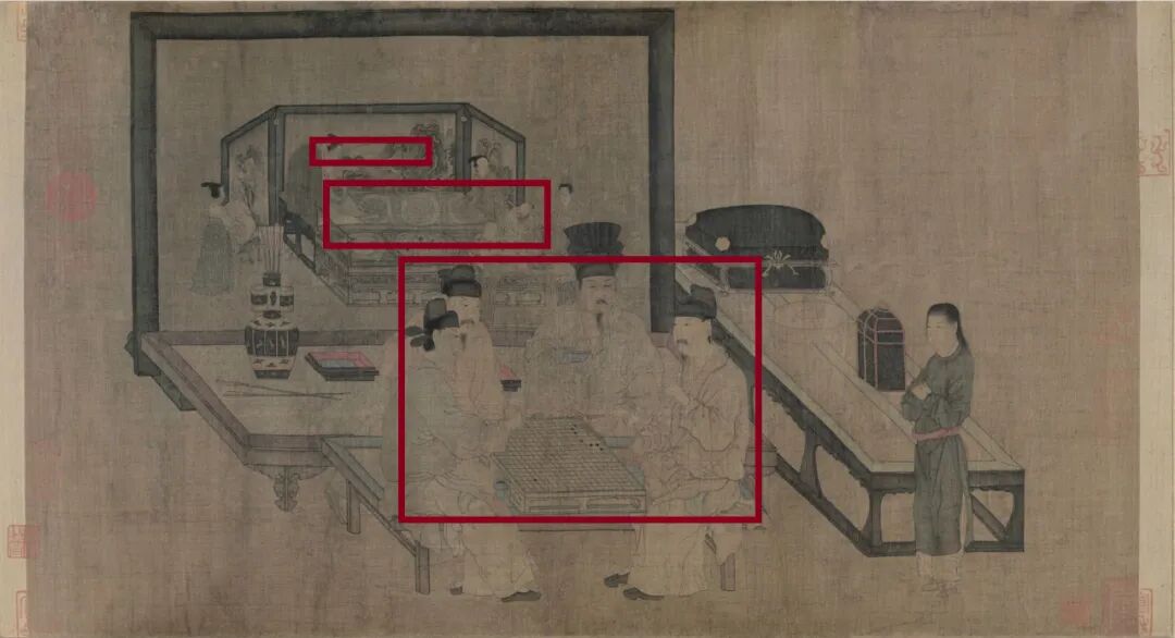 乍一看,画上只是四个男子在下棋(会棋),身后有重屏,故后人呼为《重屏会棋图》。虽然屏风多了点,一眼看去,也就是几个人下棋,没甚么出奇。但其中却藏了诸多彩蛋和惊奇。