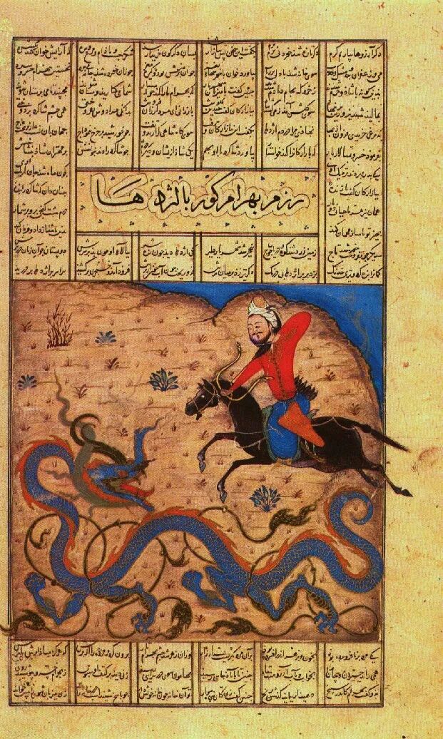 ▲[伊朗]菲杜希《斯摩奇(大鹏鸟)把扎尔带到艾尔布鲁兹山上》,约1370年上图中大鹏鸟的形象乍看极似中国的五彩凤凰,既然有凤,自然有龙,细密画里龙的形象又何尝不是中国龙的气派呢?![]()
