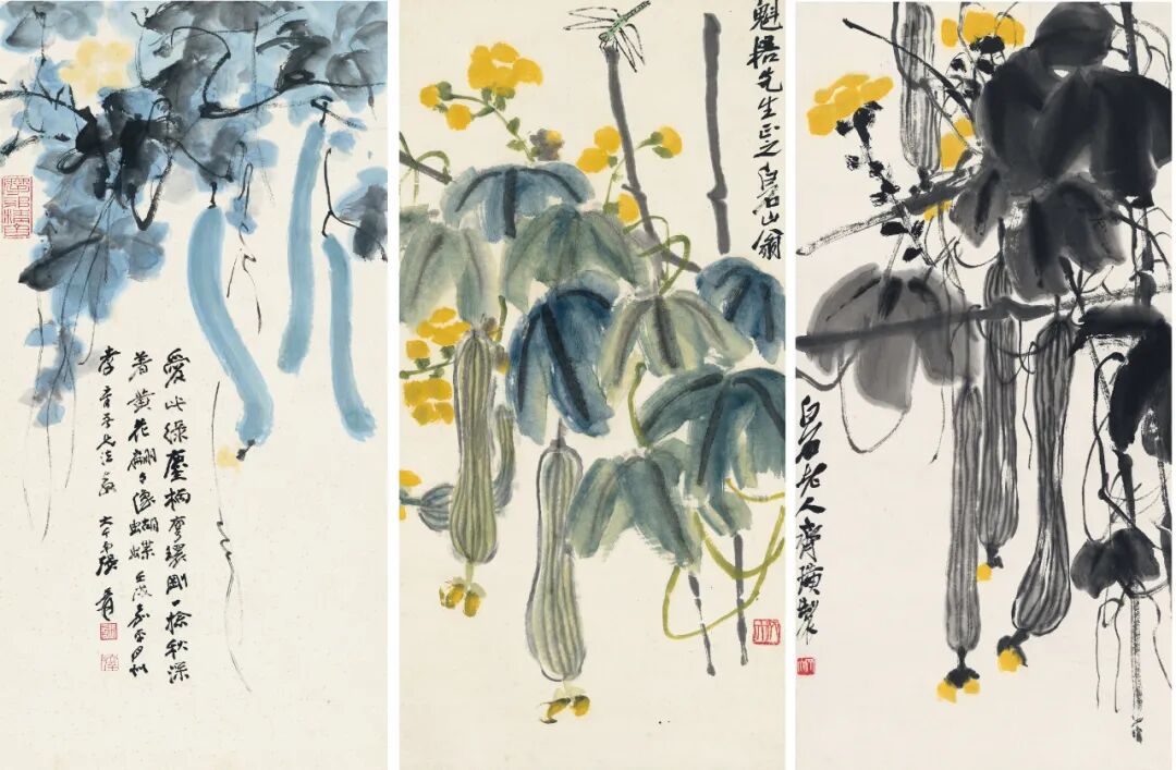 齐白石《瓜园蜻蜓图》、齐白石《瓜瓞绵绵图》、张大千《为严孝章作 瓜瓞绵长图》