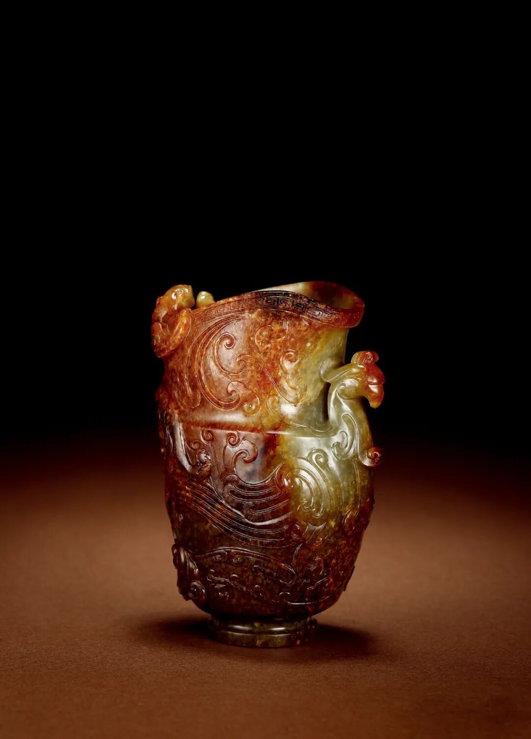 明-清·玉雕红沁仿古龙凤纹觥形杯