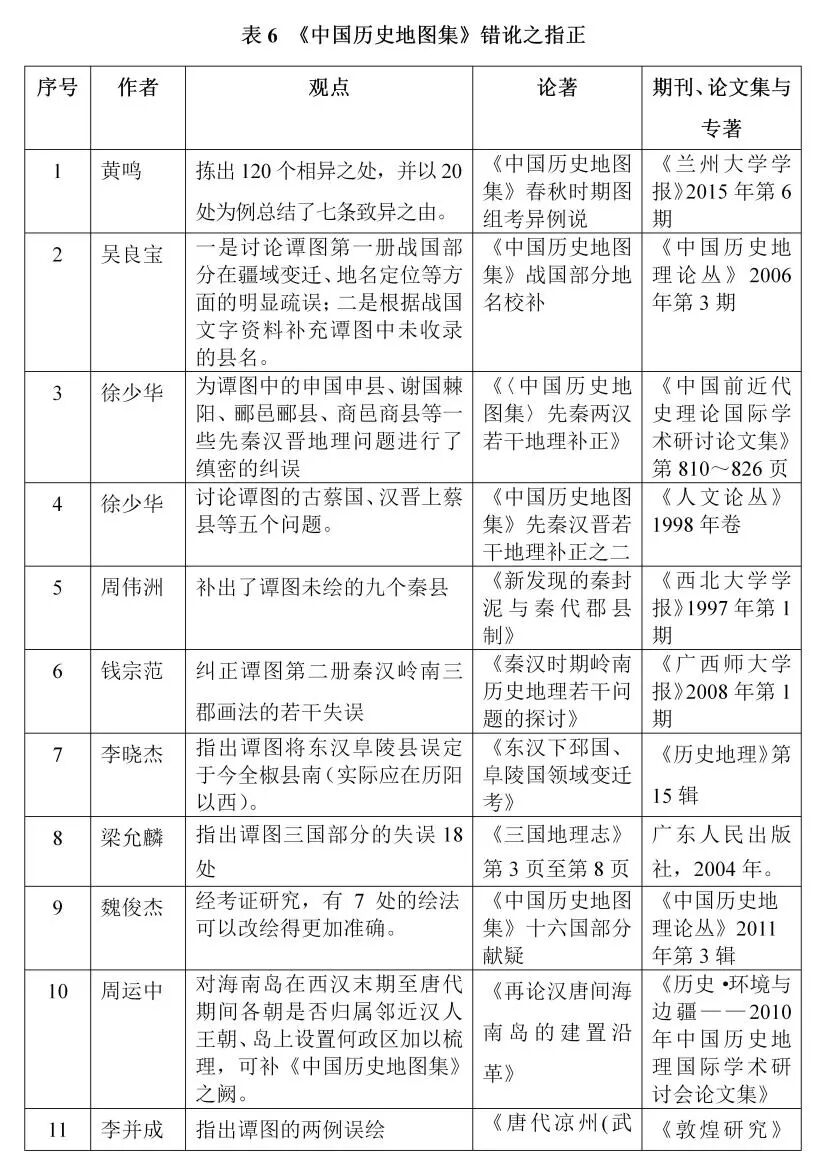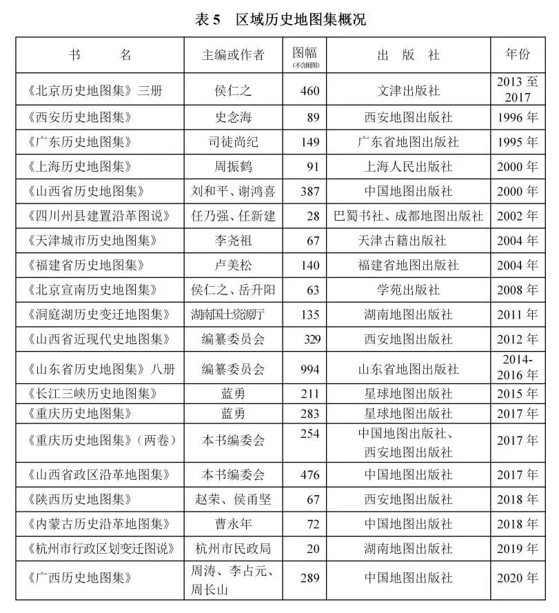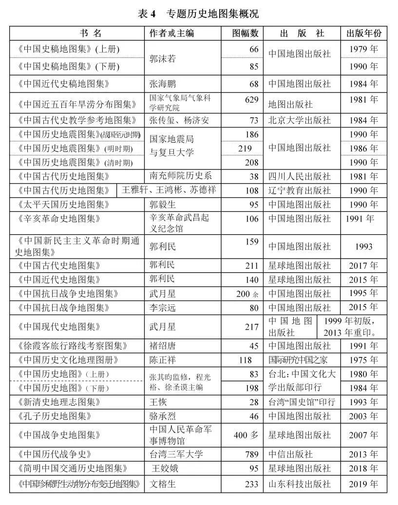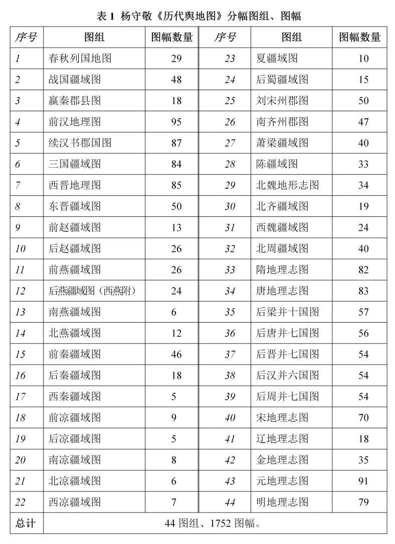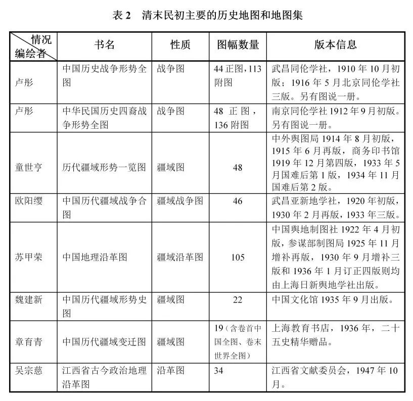 谭其骧曰:“地理之学,非图不明”。此处的“图”,包含了古地图和历史地图两大学术领域。本文的关注对象属于历史地图领域,限于严肃的历史地图(集),时间断限上起清末、下迄于今,地域范围为“历史上的中国”,不涉及教学挂图、电子地图。历史地图是历史地理学的第二语言,历史地图的研制和编绘是中国历史地理学最富特色的领域,也是历史地理学取得显著成就的一个重要方面。中国学术具有编绘历史地图的悠久传统。西晋裴秀主持的《禹贡地域图》十八篇所提出的“制图六体”,为中国传统制图学奠定基础,在世界地图学史上有重要地位,可惜业已失传。唐代贾耽绘《海内华夷图》首创“古墨今朱”的历史地图编绘设想,只不过当时刚露出嫩芽的印刷技术做不到;北宋税安礼《历代地理指掌图》是保存至今最早的一部古人编绘的历史地图集,编有北宋以前的历史地图四十三幅。这类历史地图,南宋有傅寅《禹贡说断》附《禹贡山川总汇之图》、陈元靓《事林广记》附《历代国都图》,元有信州石刻《六经图》、王喜《治河图略》附《禹河之图》,明吴国辅有《今古舆地图》、陈沂有《金陵古今图考》。清胡渭《禹贡锥指》卷首,有《禹贡图》四十七幅;清李兆洛《历代地理沿革图》绘有《禹贡九州图》《春秋列国图》《秦三十六郡图》及西汉以下历代地理志地图二十二幅等。清末历史地图之编绘, 规模大的可举杨守敬《历代舆地图》为例。它是“我国历史地图里面空前的杰作”,不愧是历史地图绘制史上的里程碑,达到了清末的最高成就。以下简称“杨图”。杨图线装书有三十四册,总体上分为两大部分:前一部分为《历代舆地沿革险要图》,线装一册,系杨守敬先于同治二年(1863年)与邓承修、后于光绪五年(1879年)与饶敦秩合作绘成,主要是历代疆域形势图、四裔图等,性质相当于总图,光绪丙午(1906年)重订本共71幅;后一部分为历代“地理志”图,线装三十三册,始绘年代已不可查考,熊会贞出力尤多,刻印地点有邻苏园、鄂城、菊湾、武昌、沪上等地,最终完成于宣统三年(1911年),性质相当于各个朝代分幅图。杨图付梓至今正逢110周年,谨此纪念。杨图情况,可统计如下:杨图分幅图共有44图组、1752幅地图,春秋图组画出《左传》地名,战国图组画出《战国策》地名,嬴秦图组以《汉书·地理志》与综合清儒诸家考证为据,汉代以后各图以相应的各正史“地理志”为主画出各朝政区和山川形势,最多的西汉图组由95幅图组成,最少的西秦图组和后凉图组也有5幅地图。它采用朱墨套印之法,朱图即是作为底图的胡林翼《大清一统舆图》,墨图即清朝以前的历代各图,是杨守敬博考群书后为历代正史《地理志》中地名确定方位、里距后上图的。每幅地图的地名承载量,若平均以二十五个来估算(因为要删汰重复),则这套地图集大约收录地名四万三千多个。它是在谭其骧院士《中国历史地图集》之前我国历史上朝代最为完整、内容最为详细的一套大型历史地图集。中国历史悠久,疆域辽阔,大大小小的山川地名成千上万,而郡县的迁徙、地名的改易、水道的变迁十分复杂。为了画图,杨守敬考证每一个地名的确切位置、弄清每一条河流的变迁过程,往往翻检许多典籍,甚至对《水经注》、历代正史《地理志》作了详尽的疏证,贡献巨大。杨守敬与弟子熊会贞另有《水经注图》,计有八册、40卷(另有补图1卷)、598幅,观海堂于光绪三十一年(1905年)刊刻,朱墨套印(底图为红色的胡林翼《大清一统舆图》),计里画方(每方五十里),内容与其巨著《水经注疏》相配合。杨守敬之后,虽也出版过一些历史地图,如童世亨《历代疆域形势一览图》、苏甲荣《中国地理沿革图》等,但规模上没有一部能超过杨图的。清末民初编绘历史地图的主要情况,详见表2。另外,当时一些学术著作和论文中,有时也附有单幅的历史地图。如1930年2月出版的谢国桢著《清初东南沿海迁界考》,附有迁界图;黄文弼编《高昌疆域郡城考》初版于1932年3月,书后附吐鲁番古地分布图、高昌郡城疆域图;1935年顾颉刚发表于纪念蔡元培六十五岁诞辰文集的《两汉州制考》,附有《西汉州郡图》;顾颉刚、史念海合著《中国疆域沿革史》(长沙:商务印书馆1939年出版),有自夏商周至民国的历史地图27幅;1947年4月上海商务印书馆出版的朱偰著《明清两代宫苑建置沿革图考》,附有明代宫禁图、清代宫禁图;发表于1944年9月《中国文化研究汇刊》卷四上的徐益棠《南宋杭州之都市的发展》,附有地图;侯仁之发表于《燕京学报》第30期上的《北平金水河考》,也附有地图。例繁不备举。从上述可以看出,清末民初历史地图集编绘的主题以疆域、政区、战争等为主。这个传统绵延不绝,一直被1949年以后的历史地图所继承。目前学界广泛使用的谭其骧院士《中国历史地图集》,最初就由重编改绘杨守敬《历代舆地图》而来。在所有关于中国的历史地图中,由中国社会科学院主办、谭其骧院士主编的《中国历史地图集》(八册)是迄今为止成就最大、观点最权威的成果,王钟翰回忆说:“作为一部以历代疆域政区为主的普通地图集,乃迄今国内外同类地图中质量最高、内容最详、印制最精、应用最广、影响最大的地图集”。笔者以下简称为“谭图”。国内影响自不必说,凡海外有汉学(“中国研究”)的大学与研究机构,多收藏了谭图
