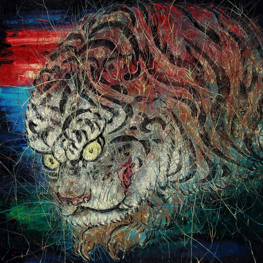 曾梵志的《虎》作为永乐2020年全球首拍“现当代艺术夜场”专场的封面作品,以4025万元的价格成交。《虎》创作于2017年,是近年来曾梵志将不同风格、不同画题,汇聚为一,与经典绘画相互碰撞的新方向典范之一。曾梵志笔下的老虎不在少数,但这件《虎》的尺寸巨大,达4×4米,这种大尺寸的方形尺幅在曾梵志的作品中并不常见,配合虎的图像能让人感觉到“撼人之势”,是之所以能拍出高价的主要原因之一。老虎从面面右上角以对角线姿态切入方形画面,带有一种似乎要跃动着走入画面的豪壮气势,生机勃勃又充满动感。画面处理上,艺术家将视觉重点聚焦在老虎的面部,充满流畅感的弧形填满整个方形画布。人们认知中的虎头被骤然放大,熟悉的图示也增加了一些意想不到的冲击感,对于初见此作的观者来说必然是一种全新的视觉体验。