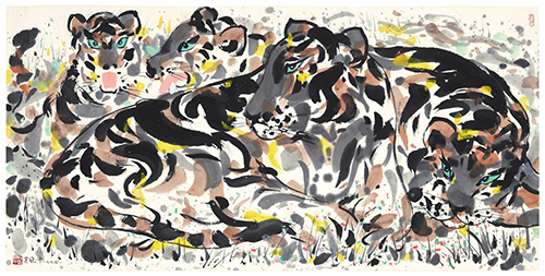 《群虎图》曾为北京荣宝2006年春季大型书画拍卖会“当代中国画风貌”封底作品,彼时的成交价为231万元。五年后,再于荣宝斋2011首场大型艺术品拍卖会上上拍,以1495万元的价格拍出。《群虎图》创作于1990年。《老虎高原》之后,吴冠中画老虎的欲望和激情被点燃。画面中老虎取卧势,以浓墨点染斑纹,具有很强的视觉冲击力;老虎鼻子与胡须处画得精致,可见其粗中有细;又以黄色绘老虎的眼球,又以浓墨点出眼珠,虽是卧虎却虎视眈眈,眼神清冷,令人望而生畏。吴冠中用变形、分解、扭曲等西方现代艺术手段去改变和突出老虎形象,充满了装饰性与简洁性,整幅画面具象与抽象结合,结构缜密,构图饱满。该作曾参加1992年3月在香港中华文化促进中心举办的“九十年代的吴冠中”展览,作品收录于《九十年代的吴冠中》。
