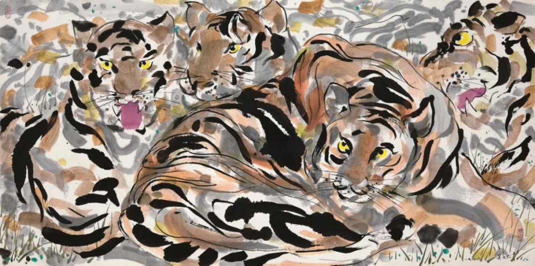 这是吴冠中所绘的另一幅《老虎》,也是其在1990至1994年创作的五幅《老虎》画作的压卷之作。该作于2013年保利香港春拍上以1265万港元成交。吴冠中在《老虎》呈现书法性线条风格,遒劲刚古、温厚圆融。他把中国书法之钩深,笔势游转,侧峰、横笔、曲笔,横竖直拉等重新带入中国画的创作之中,成为具象绘画的造形表意元素。彩墨色点、灵动流转的线条,同时也在疏密有致的不同组合间,全面的驾驭整个画面空间,创造了画面的韵律节奏、生命动感及视觉张力,表达独特的形式美感、深刻意境及新意象。吴冠中因此赋予传统的水墨线条和色点全新的时代意义,表现为西方抽象艺术的形式语言。《老虎》一作交错辐辏多重艺术层次,出于自然高原,归结于人文动物,又以动物造型寄喻中国人俊拔刚健的生命精神,隐然承传中国古代文化的天道宇宙观及文化习惯。群虎之形态,蕴藏着彩墨线条的婉延流转韵律节奏与美感,具象与抽象完美连接,内容与形式互相呼应。![]()