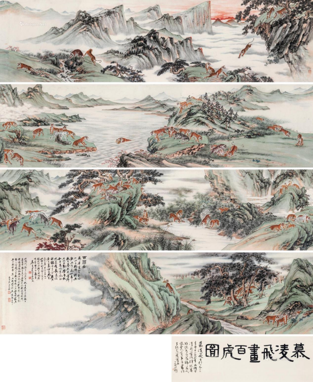 此幅作品是慕凌飞代表作《百虎图》终稿前的稿本,以2012万元的价格于2020年在中鸿信国际拍卖有限公司拍出。慕凌飞,名倩,字凌飞、以字行,别署虎翁。16岁时在上海拜张善孖、张大千为师,为大风堂入室弟子。他吸取了张善孖先生画虎的神髓,又习得张大千画山水的恢弘气度,因此被张大千委以重托,完成其师张善孖未竟之志。慕凌飞不负众望,倾注了毕生精力和心血,历时三十余载完成了《百虎图》长卷。慕凌飞以“虎”讴歌祖国繁荣富强,“英雄人民如虎威王,蓦然长啸,群丑逃亡,勤劳勇敢,和平高亢,东风劲吹,西风垂丧,建设祖国,永享安康,共产主义,万丈光芒”。画面上集结了天下各路的兽中之王,有东北、华南、福建,以及印度、南亚、非洲等老虎。百只老虎栩栩如生,或卧,或坐,或立,或奔,或腾跃,或觅食,或怒吼,神情各异,千姿百态。背景山水也极具巧思,其布置、用笔、设色、实对、远近等,无不经营有致,与画面中的老虎配合得相得益彰。