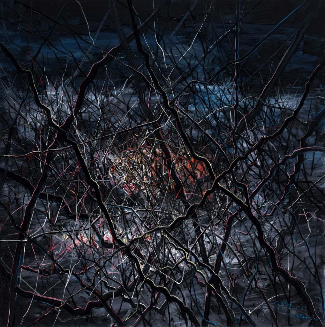 去年北京保利秋拍中,曾梵志创作于2011年的作品《虎》以400万元起拍,引起现场藏家及网络藏家的激烈争夺,经过近20分钟的激烈竞争,最终以970万落槌于网络藏家,加佣金以1115.5万元成交。曾梵志于2010-2012年间创作了一批动物作品,量少而精,其中包括象、鹤、鹿、虎等,均是中国传统文化中具有吉祥寓意的动物。威武刚健的猛虎贵为百兽之王,是权利与力量的象征。曾梵志将虎置于画面中心的远景,走姿气势勇武。动物的面部成为画面的焦点,双目圆瞪,张嘴咆哮,虎躯在凛冽的枝桠中若隐若现,仿佛猛虎即将冲破乱枝向画面前的观众走来。