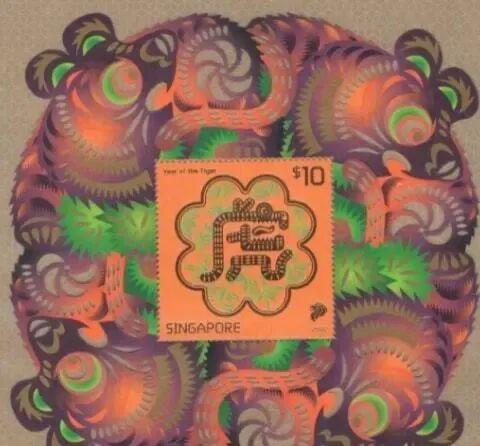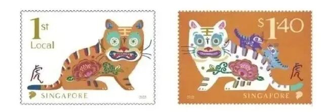 新加坡邮政于2022年1月7日发行“虎年”邮票一套2枚,小全张、小型张各一枚。邮票图案为虎的造型,小型张图案为中文“虎”字。