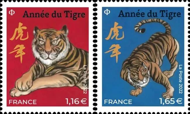 2022年1月22日,法国邮政发行了一套2枚农历生肖虎年邮票。