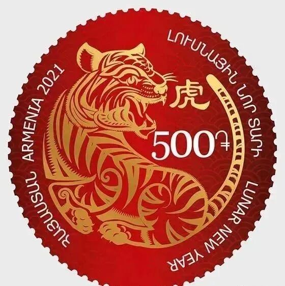 2021年12月23日,亚美尼亚邮政发行“虎年”邮票(圆形)一套1枚。图案为虎和中文“虎”字。