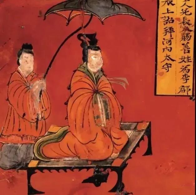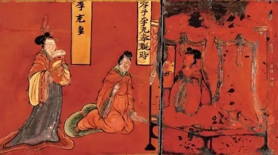 屏风之背,居上的三幅,皆表扬德行。第一幅《李善养孤》,独坐式小榻上坐着头著远游冠的小主人,身后有童子高擎伞盖,对面则是行礼如仪的仆人李善,事见《后汉书》卷八一《独行列传》。不过题记云“诏拜河内太守”,与《传》中的诏拜太子舍人不同。