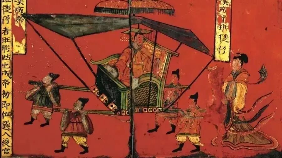 又漆画屏风的班姬辞辇之幅,绘四人下著膝下束带的袴褶,舁辇而行。《艺文类聚》卷一五引《汉旧仪》:“皇后、婕妤乘辇,余皆以茵,四人舆(舁)以行。”那么这里的安排,自有切实的依据。袴褶最初是汉装,它的出现可溯至东汉末,后并通行于南北朝,河南邓县学庄村南朝墓出土的模印画像砖中有一幅步辇图,图中一人打扇,四人舁辇,五人均著袴褶,即是一例。不过袴褶在北朝的流行,似要到北魏迁洛之后,司马金龙墓屏风画创作于北魏平城时代,则袴褶的取式或本自南朝。与《女史箴图》摹本的同题之作相比,漆画屏风中的这一幅画笔朴拙,少逊生动,但却更为近实,而从构图看,班姬的形象似乎更为突出。