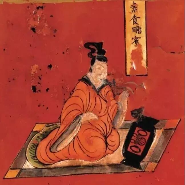 榜题“素食赡宾”的第三幅,左侧客位布席,席前设食案,案置耳杯,又五子樏与盘,著远游冠者坐客席,为郭林宗,对面则是素食赡宾的茅容。事见《后汉书》卷六八,其记郭太亦即郭林宗奖拔士人事,云陈留茅容“年四十余,耕于野,时与等辈避雨树下,众皆夷踞相对,容独危坐愈恭。林宗行见之而奇其异,遂与共言,因请寓宿。旦日,容杀鸡为馔,林宗谓为己设,既而以供其母,自以草蔬与客同饭。林宗起拜之曰:‘卿贤乎哉!’因劝令学,卒以成德”。