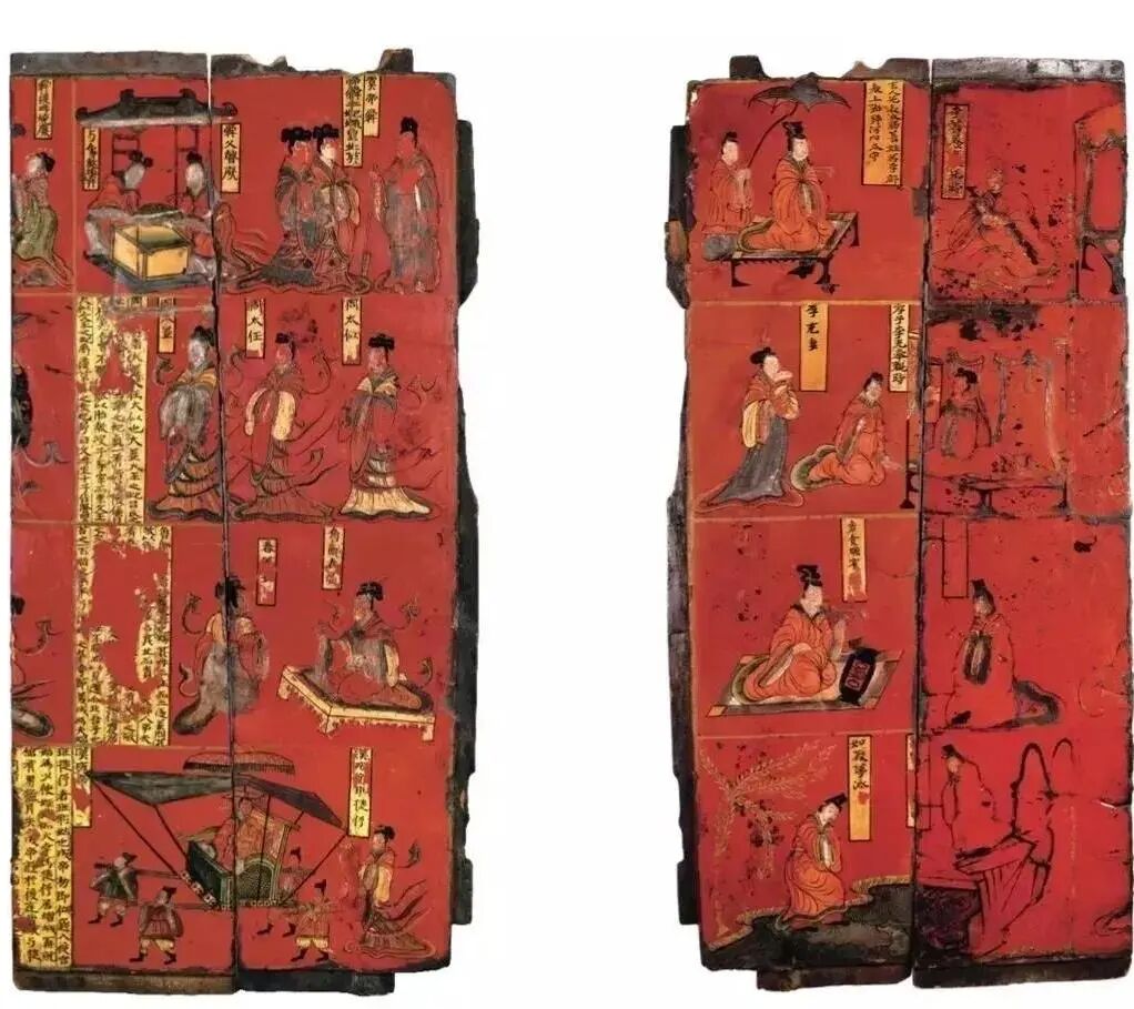 山西大同北魏司马金龙墓出土漆画屏风,创作在太和八年之前。屏风所绘列女,为《列女母仪图》,《列女仁智图》,《列女贞顺图》。有关屏风画的全部材料,至今尚未见一一刊布,仅就已经发表的部分而论,见于《列女传·母仪传》者,为《有虞二妃》,《启母涂山》,《周室三母》,《鲁之母师》,《鲁师氏母》。《仁智传》,为《孙叔敖母》,《卫灵夫人》。《贞顺传》,有《蔡人之妻》,《黎庄夫人》。《续列女传》,则有《班女婕妤》,不过班姬之幅,画中题记并不是采自《传》文,而是节略《汉书·外戚传》中的叙事。