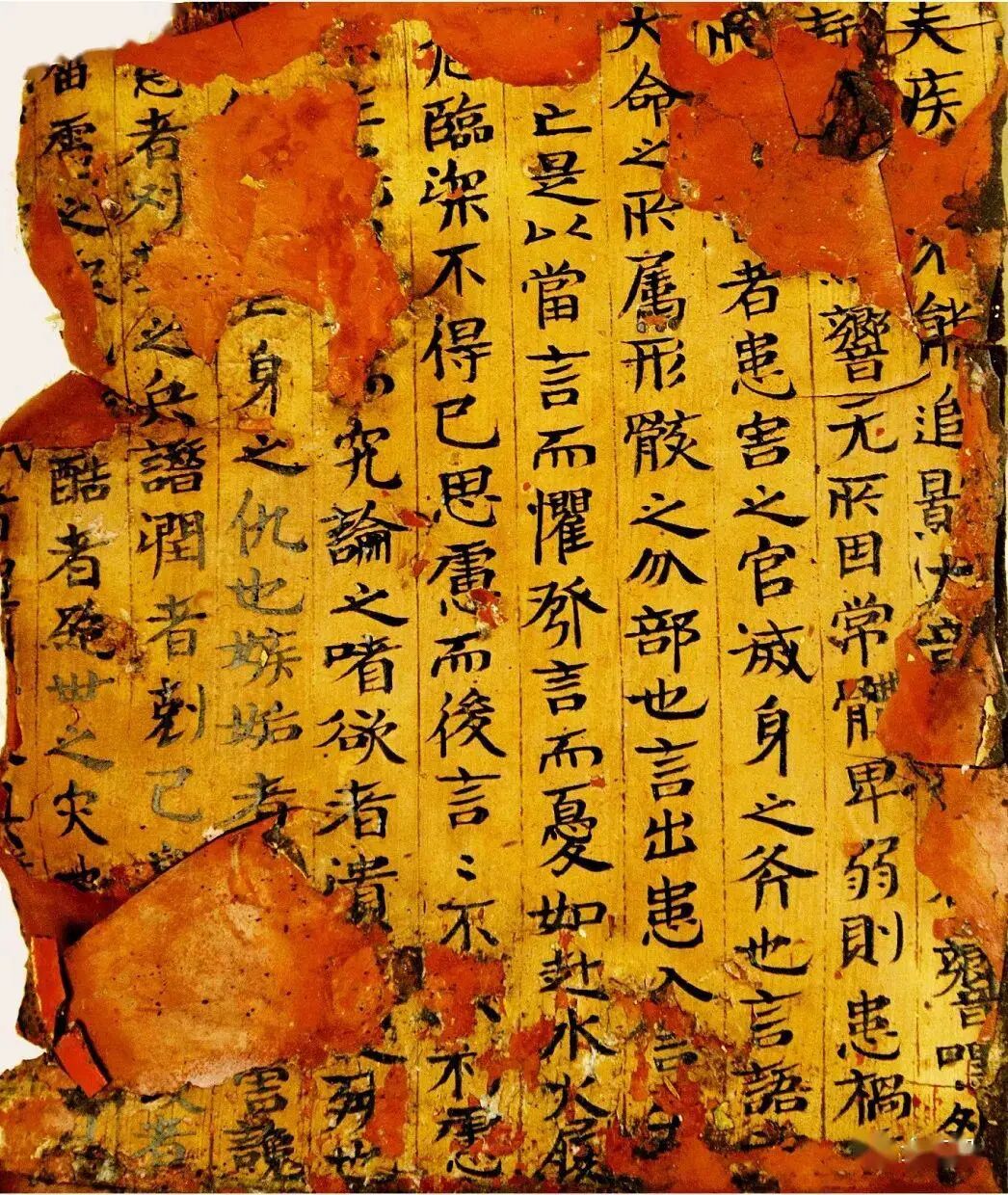漆画残片中,尚有绘三人对话的一幅,榜题作“张孟谈”、“高赫”,有题记五行,简报未录。此当是赵襄子论赏故事,出《韩非子》。其《难一》篇云:“襄子围于晋阳中,出围,赏有功者五人,高赫为赏首。张孟谈曰:‘晋阳之事,赫无大功,今为赏首,何也?’襄子曰:‘晋阳之事,寡人国家危、社稷殆矣,吾群臣无有不骄侮之意者,惟赫子不失君臣之礼,是以先之。”这一幅似乎也当在屏风之背。据已经公布的材料,大体可以推知,屏风正面图画列女,屏风之背图画先贤。