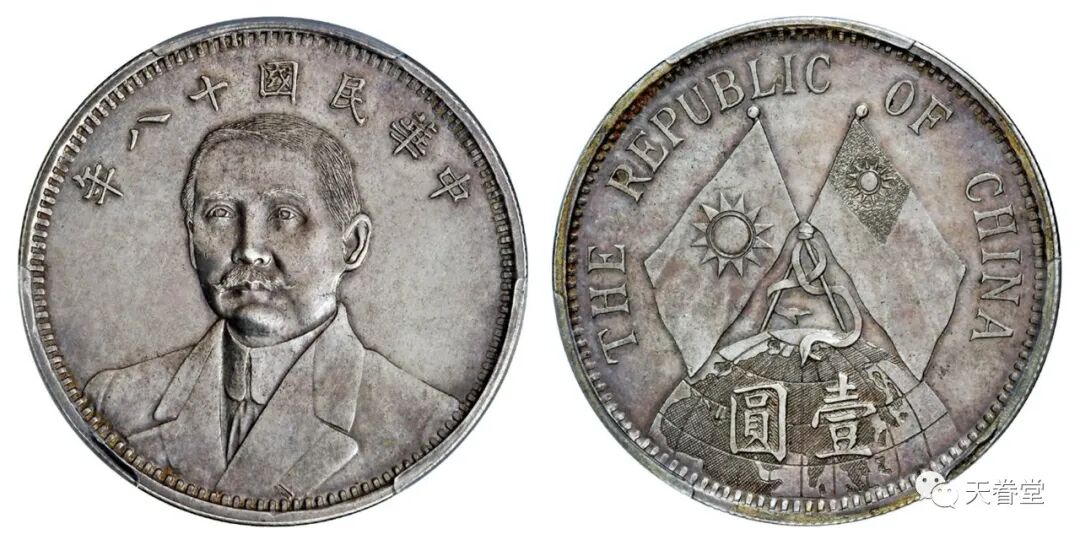 民国十八年孙中山像背地球双旗图壹圆银币试铸样币,天津造币厂试铸,未发行,为中国近代人像币经典之作,泉界公认“乃中国银币最美一品”,PCGS SP61 北京诚轩1265万元