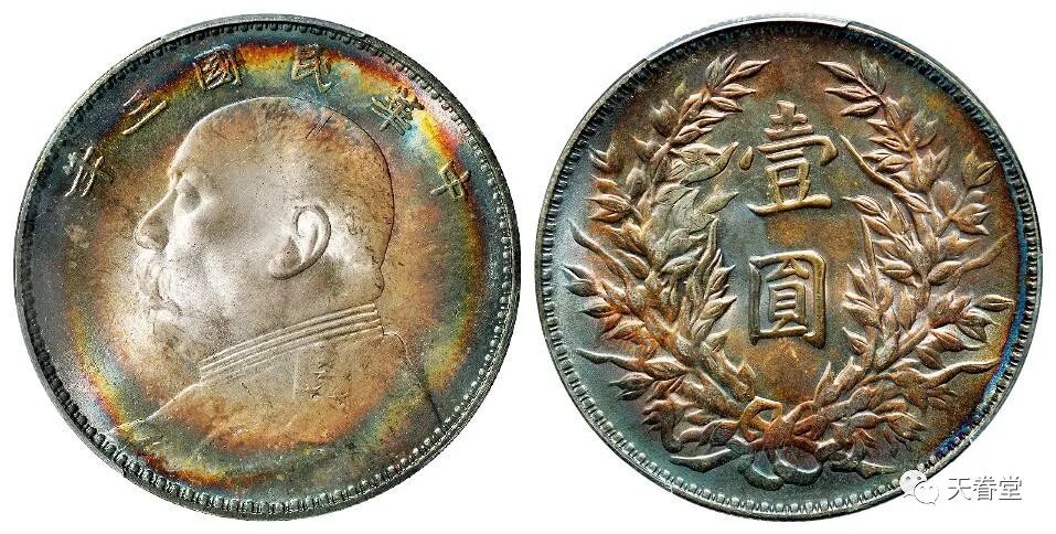 民国三年袁世凯像壹圆 三角圆,呈环状悦目虹彩,红蓝渐变,状态极佳,PCGS MS65+ 北京诚轩184000元